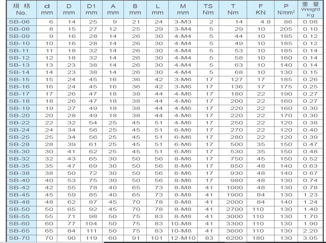 仕勛SB-18 SB-20 SB-22免鍵式軸套 軸環(huán)使用上的注意事1 所需傳動扭力的確認2 軸與孔的加工精度要求3 同心度的要求4 是否有防銹的需求以上為一般注意事項,若有特別需求,請與我們聯(lián)絡
